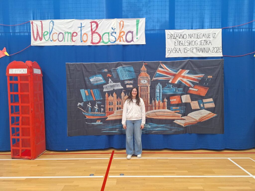 Svestrana učenica naše škole Helena Kosina, 8.b, ostvarila je odličan uspjeh na Državnom natjecanju iz engleskog jezika koje se održalo u Baški na otoku Krku od 15. – 17.4.2026. (kategorija 8. razreda). Pokazala je zavidnu razinu znanja u uporabi jezika, razumijevanju pročitanog teksta, slušanju s razumijevanjem i govoru. Ponosni smo na našu Helenu i njezine uspjehe koje vrijedno i kontinuirano postiže u promicanju engleskog jezika. Čestitke Heleni i mentorici Zvonimiri Radić-Sršić!