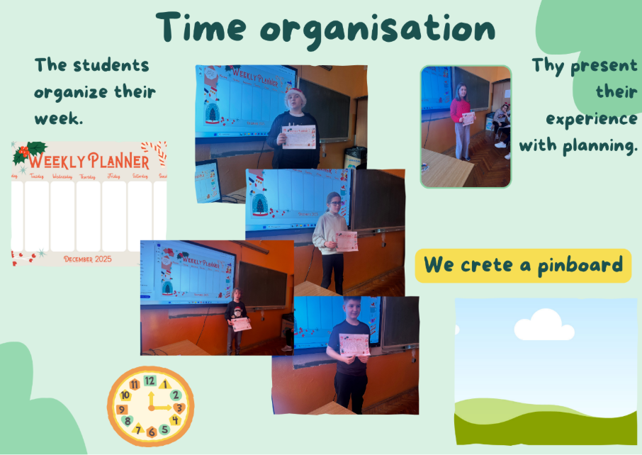 U prosincu smo započeli aktivnost vezano za organizaciju i planiranje vremena. Učenicima su podijeljeni tjedni planeri te je dogovoreno da vode plan svojih obaveza i aktivnosti, a po tom je slijedila i prezentacija i podjela iskustava. Većina učenika ne planira svoje vrijeme i obaveze, dok jedan dio to radi redovito ili su imali pozitivna iskustva s ovom aktivnosti. Samo jedan mali dio učenika ne smatra planiranje vremena korisnim.