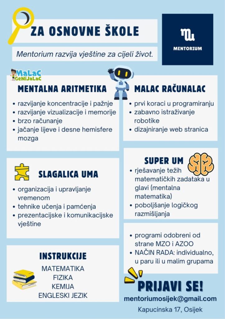 Mentorium je edukativni centar koji nudi podršku učenicima osnovne škole kroz instrukcije i programe usmjerene na razumijevanje gradiva i razvoj učinkovitih strategija učenja. Programi su odobreni od strane Ministarstva znanosti i obrazovanja kao i Agencije za odgoj i obazovanje.